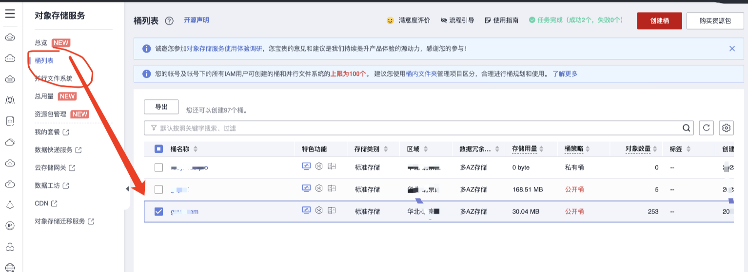 首先呢,我们在华为云的服务列表里的存储类里面找到对象存储服务OBS。进入之后我们点击右上角的创建桶